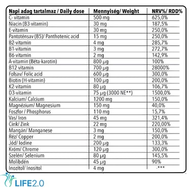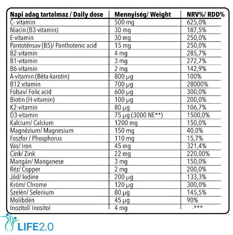 LIFE2.0 multivitamin® por tartalmazza az összes vitamint és ásványi anyagot, amire szüksége van bariátriai műtét (gyomor bypass vagy sleeve) után. Túlsúlycsökkentő műtét után bizonyos vitaminok felszívódása jelentősen csökken, leginkább a vas, kalcium, D vitamin és a B12 vitamin felszívódása érintett. Emiatt műtét után vitaminok szedésére feltétlenül szükség van, mert nem megfelelő bevitele esetén tartós egészségkárosodás léphet fel, vészes vérszegénység (anémia) alakulhat ki, súlyosabb esetekben pedig idegrendszeri károsodás és csontritkulás is előfordulhat.
